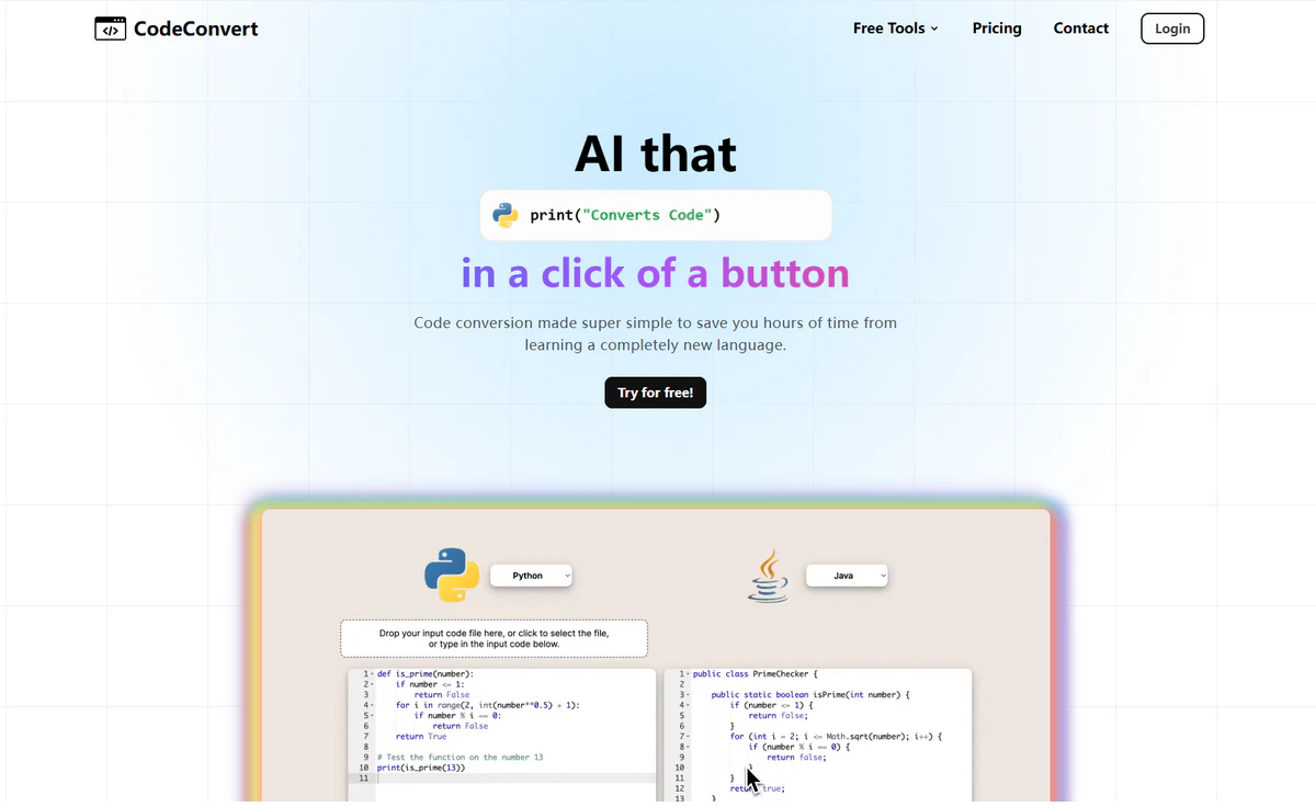 CodeConvert AI 是一款专注于跨编程语言代码转换的智能在线工具,能够帮助开发者快速将代码在不同编程语言之间进行转换。以下是其主要特点和相关信息: