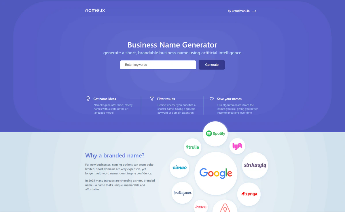 - logo设计工具ai logo生成ai品牌设计ai名称生成NamelixNamelix是一款基于人工智能的商业名称生成工具,由Brandmark.io开发,专注于为初创企业、品牌项目、产品等提供简短、易记且具有品牌感的名称建议。