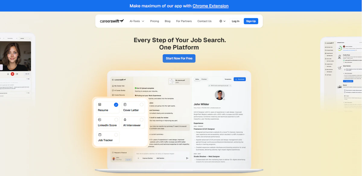 CareerSwift是一款AI驱动的智能求职全流程助手,定位为"一站式求职管理平台",通过人工智能技术帮助求职者优化简历、自动申请工作、跟踪求职进度,并提供面试准备支持。