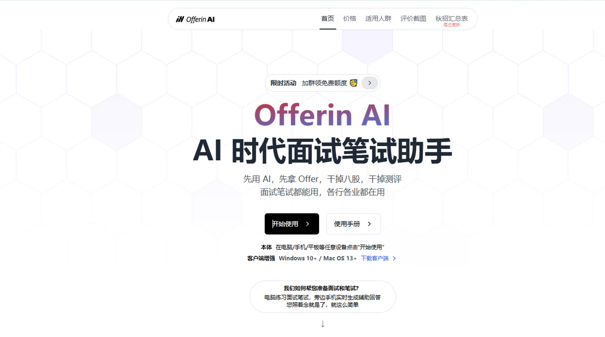 Offerin AI(也称"OfferIN"或"Offer IN")是一款专为在线面试和笔试场景设计的智能面试辅助工具,通过AI技术帮助用户提升面试表现,特别适用于程序员、产品经理、设计师、数据分析师、金融及财会等岗位的求职场景。